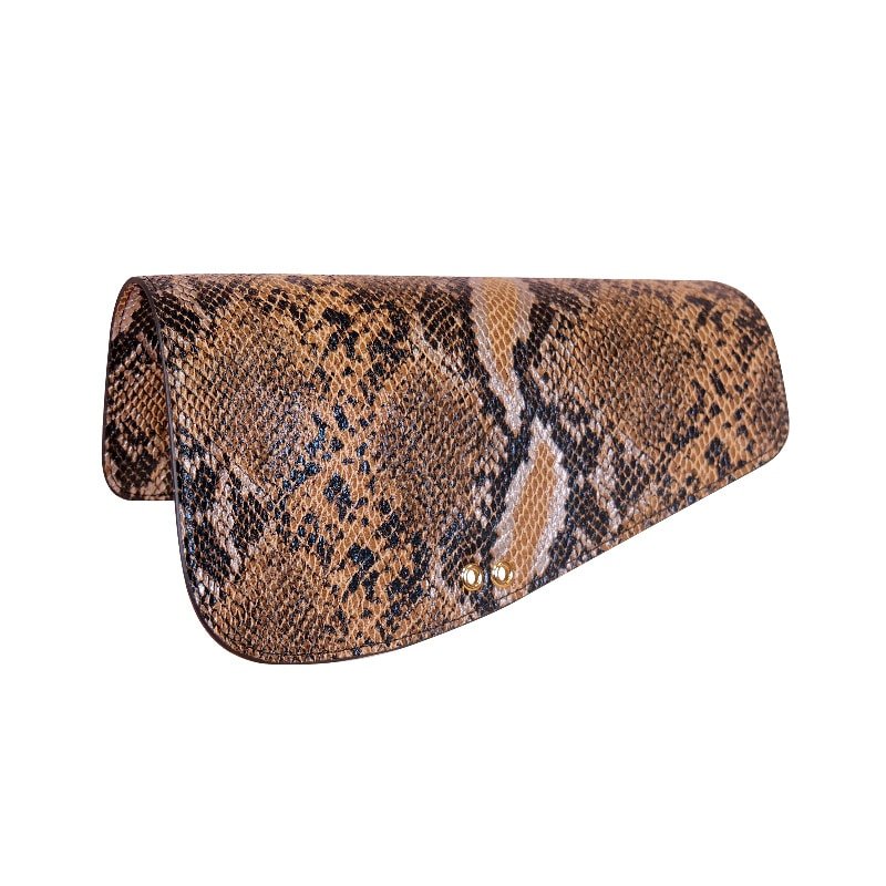 Vegan faux leather flap with multicolored snake pattern (black, brown, beige, gray).