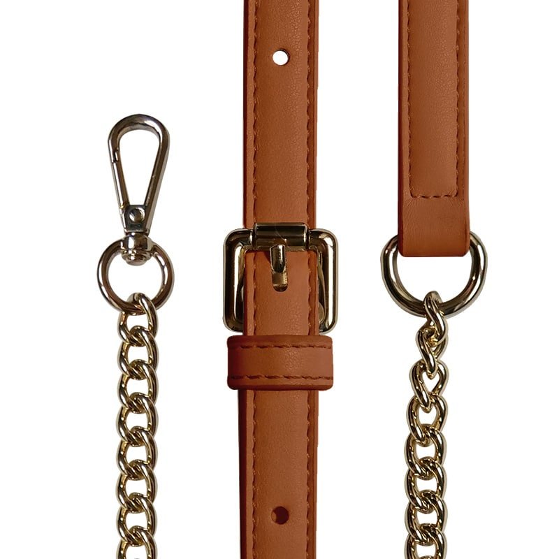 Fine caramel colored shoulder strap with golden chain. Match it with the bag of your choice to create the ideal bag. – Removable gold-plated metal clasps – Gold-plated metal chains Maximum dimension: 130 cm. Adjustable length.