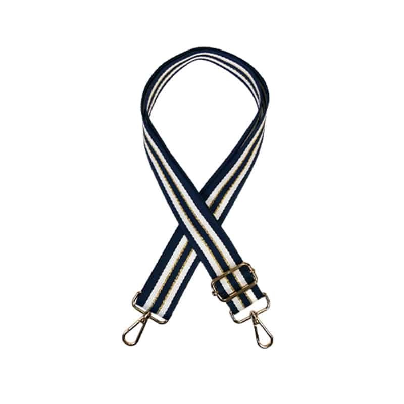 "Timeless" strap with navy blue stripes, white and golden glitter fabric, adjustable. Match it with the bag of your choice to create the ideal bag. – Removable gold-plated metal clasps – Nylon strap Maximum dimension: 130 cm Adjustable in short strap mode up to 66 cm.