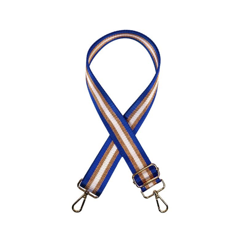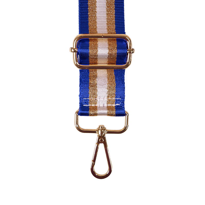 "Royale" strap with blue, white and gold stripes in fabric, adjustable. Match it with the bag of your choice to create the ideal bag. – Removable gold-plated metal clasps – Nylon strap Maximum dimension: 130 cm Adjustable in short strap mode up to 66 cm.